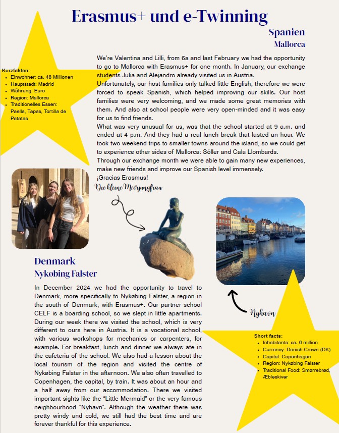 Im Rahmen eines fächerübergreifenden Projekts gestaltete die  6A im 1. Semester dieses Schuljahres eine Schüler:innenzeitung, die die Leser:innen auf eine spannende Reise quer durch Europa und durch viele Schulfächer nimmt. Mit viel Engagement gestalteten die Schüler:innen und Lehrer:innen des Sprachenzweigs diese bunte Ausgabe und ermöglichen so einen Einblick in die bunte Welt am Gymnasium Hartberg. Nach den Semesterferien wird die Zeitung in der 6A und im Konferenzzimmer zu erwerben sein. Es werden auch Gutscheine der Fahrschule Easy Drivers und des Schulbuffets verlost.