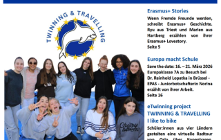 Im Rahmen eines fächerübergreifenden Projekts gestaltete die 6A im 1. Semester dieses Schuljahres eine Schüler:innenzeitung, die die Leser:innen auf eine spannende Reise quer durch Europa und durch viele Schulfächer nimmt. Mit viel Engagement gestalteten die Schüler:innen und Lehrer:innen des Sprachenzweigs diese bunte Ausgabe und ermöglichen so einen Einblick in die bunte Welt am Gymnasium Hartberg. Nach den Semesterferien wird die Zeitung in der 6A und im Konferenzzimmer zu erwerben sein. Es werden auch Gutscheine der Fahrschule Easy Drivers und des Schulbuffets verlost.